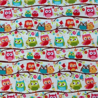 A cute cream cotton fabric featuring colourful owls sitting on a branch. It is ideal for sewing projects, making cushions, clothes, quilting, needlework, decorating children's rooms and general sewing projects. Owl height is approximately 3 cm. This high quality fabric is 110cm wide.