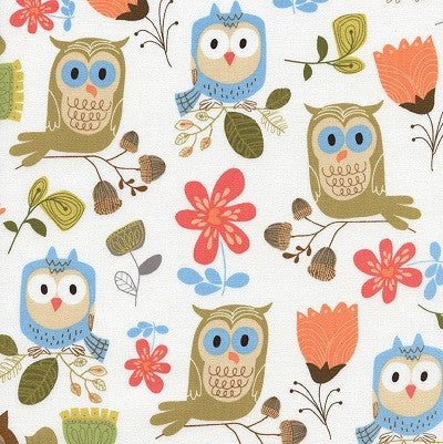 Owl White Cotton Fabric - Orange, Blue & Brown Owls 1/2 Metre